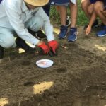 9月22日(月)、4年生のみんなとごん豆の方々にも来ていただき、大根の種をまきました。ごん豆の社長さんは、畝の作り方、種の植え方、水のやり方を教えてくださいました。