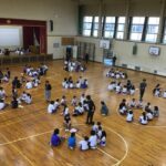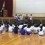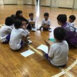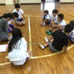 その後、新しいレインボー班のメンバー顔合わせ会を行いました。6年生16人が旗を掲げて「ここに集まって」とリーダーシップを発揮し、和やかな顔合わせ会をしてくれました。