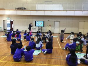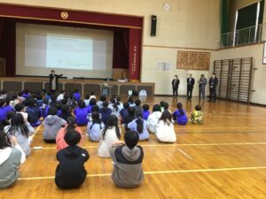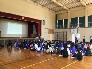 いつ起きても起きてもおかしくない南海トラフ地震やそれに伴う火災、局地的な大雨などの自然災害から身を守る防災学習をしています。今年三重県の防災班の方にお越しいただき、まず、全学年で防災についての講話を聴きました。