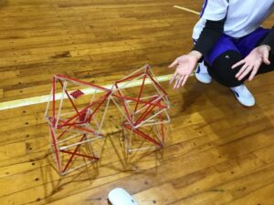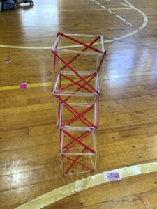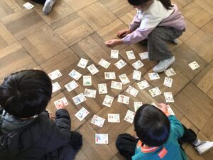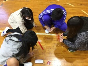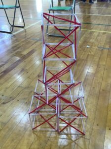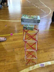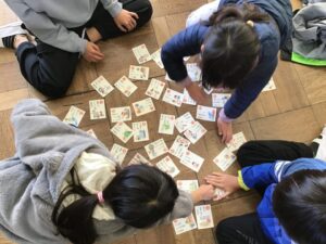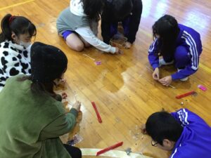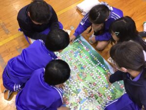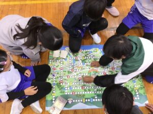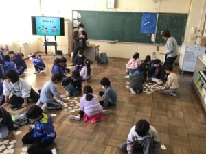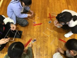 続いて、低学年は教室で防災絵本を読んでいただき、班に分かれて防災カルタをしました。楽しみながらどう行動るべきかを学びました。中学年は「防災すごろく」を班に分かれてしました。「家屋倒壊に止まった!大変や!」の声も。町のどこにどんな危険があるのか、災害発生時行動について楽しく学びました。高学年は「ストローハウス」を作りました。ストローとクリップを使って、家の模型を作ることで、地震に強い建物にするにはどうすればよいかを考えました。