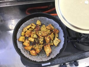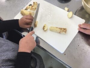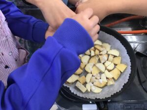 固いさつまいもを頑張って切って水にさらしてから、フライパンに敷いたクッキングシートの上に、重ならないように並べます。自分たちで砂糖を入れ、横田先生に油と醤油を入れてもらい、蓋をして火にかけます。しばらく待ってさつまいもをひっくり返し、たれが煮詰まってきたら出来上がりです。大学芋のいい匂いがしてみんなの目が輝きます。「甘くておいしい!」「家でもまた作りたい!」と大好評でした。作業や後片付けをする順番を決めるのもスムーズで、みんなで協力して活動する様子がすてきでした。