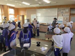12月11日(木)に、学校栄養教諭の横田先生に指導していただき、収穫したさつまいもを使って大学いも作りをしました。昨年とは違うおやつを作ってみたいという意見が多かったので、大学芋いも・スイートポテトなど、材料や作り方も含めて考えました。人気の高かった大学いもは、油で揚げるところが自分たちには難しそうです。そこで、横田先生に相談したところ、簡単にできる大学芋レシピを教えてもらいました。