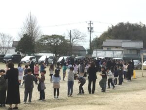 式終了後も、晴れていたので、運動場で見送りをしました。最後まで別れを惜しみながら、新しい生活へのエールを送りました。